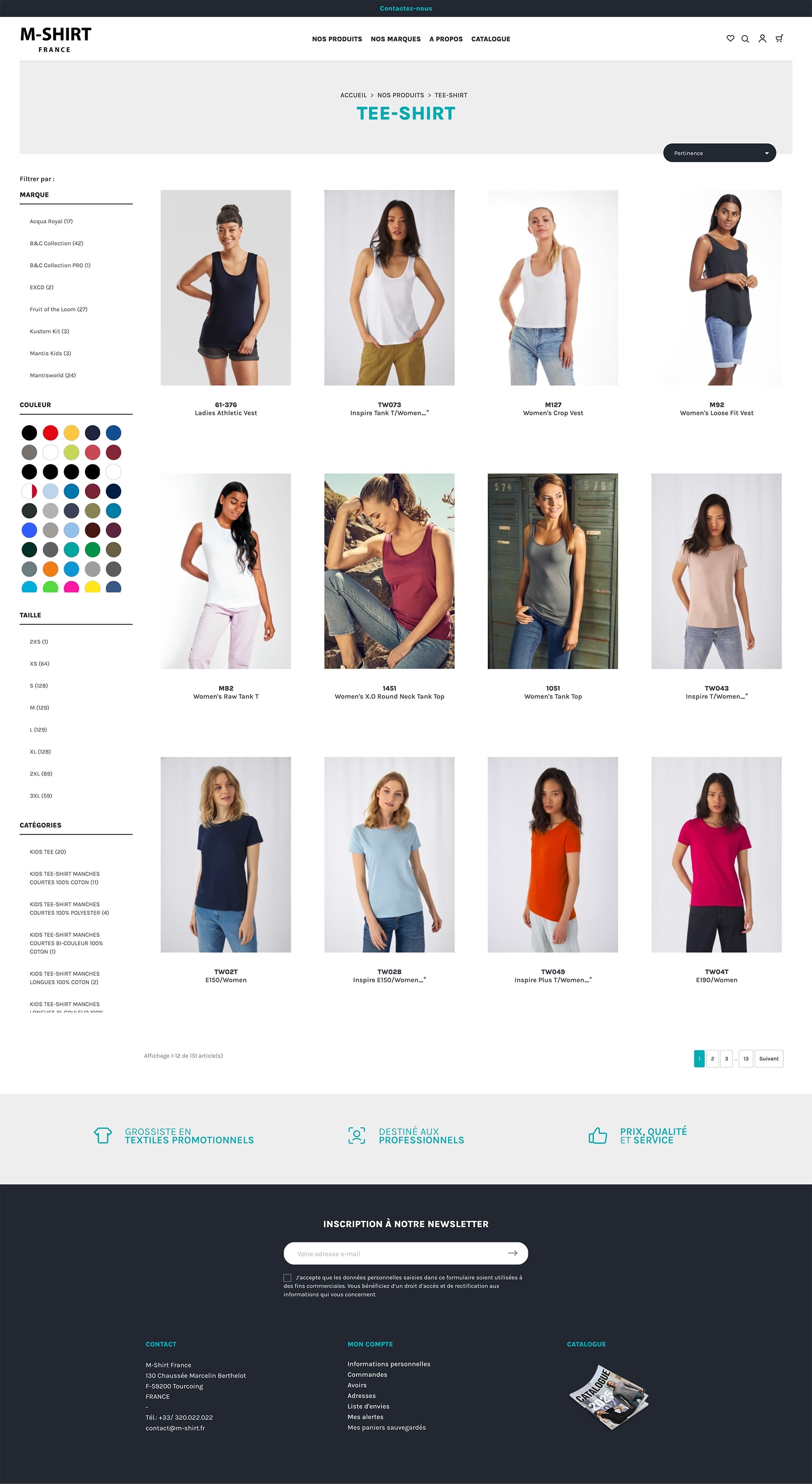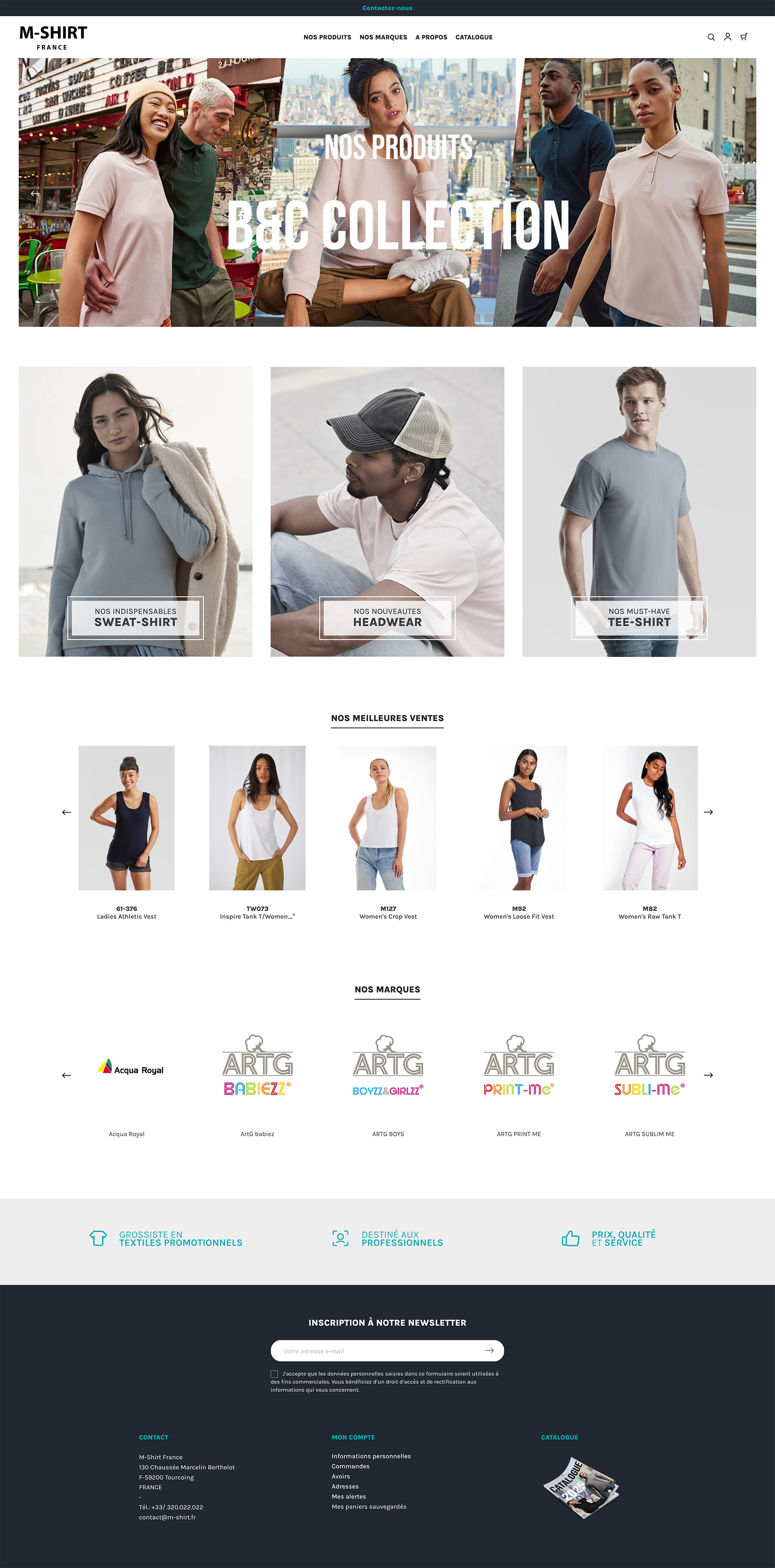 Le nouveau site M-shirt se distingue par sa structure semi-privée, permettant aux visiteurs de consulter librement les catalogues produits et les pages institutionnelles de la marque, tout en réservant l’accès aux tarifs et à la commande aux comptes professionnels validés.