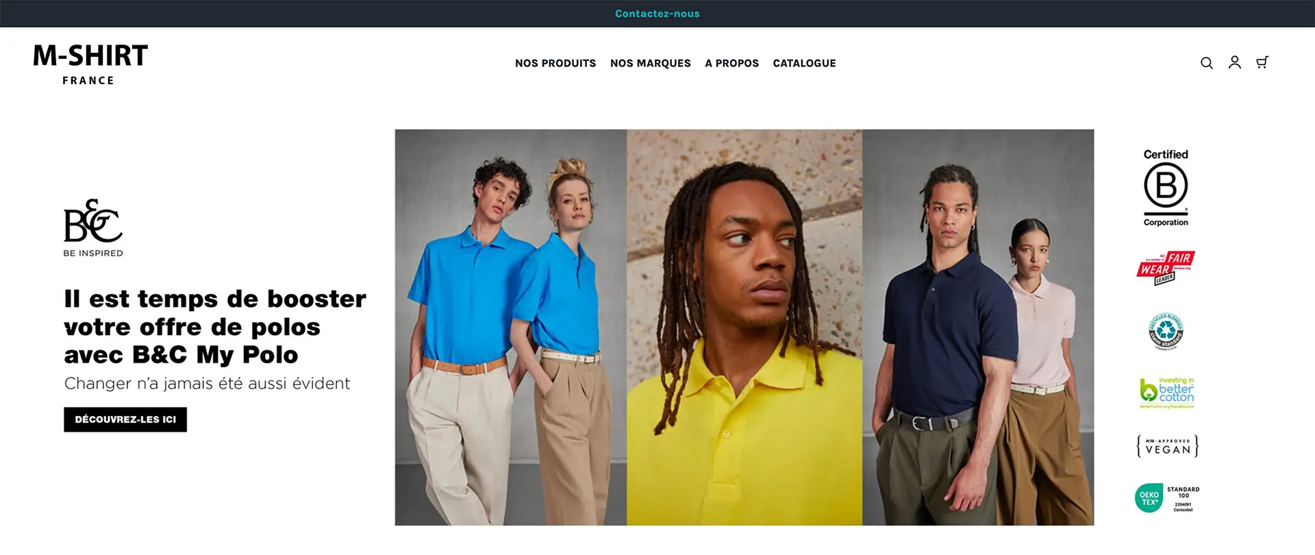 Le nouveau site M-shirt se distingue par sa structure semi-privée, permettant aux visiteurs de consulter librement les catalogues produits et les pages institutionnelles de la marque, tout en réservant l’accès aux tarifs et à la commande aux comptes professionnels validés.